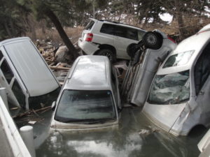 石巻市内に入ると、眼前の光景に目を疑った。何十年、否、何百年と人々が住んでいた場所とは思えない。病院にたどり着くまで、沿道には転倒した乗用車がまるでプラモデルをひねりつぶしたようにひしめき合っている。メタンガスの発酵したような異臭が鼻をつく。さながら地獄絵図である。