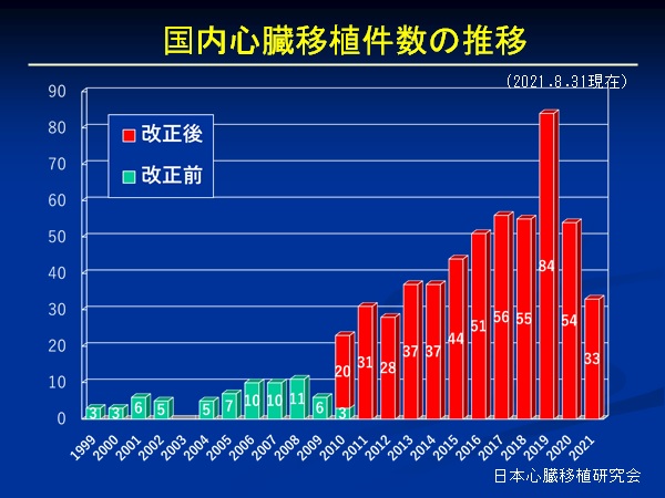 日本の心臓移植1例目は1968年に札幌で行われた。当時は、移植者について解明できない問題が残り、国内では移植そのものに反対する意見が多く残った。97年に施行された「臓器の移植に関する法律」が2010年に改正され、ドナー(臓器提供者)本人の意思が不明な場合にも、家族の承諾があれば脳死下の臓器提供ができることとなった。以来、年間移植症例が20例以上となり、2019年には全体で84例の移植症例を数えた。2020年からはコロナ禍によりドナーが減っており、今後コロナ禍が解決されると再び多くなると考えられる。