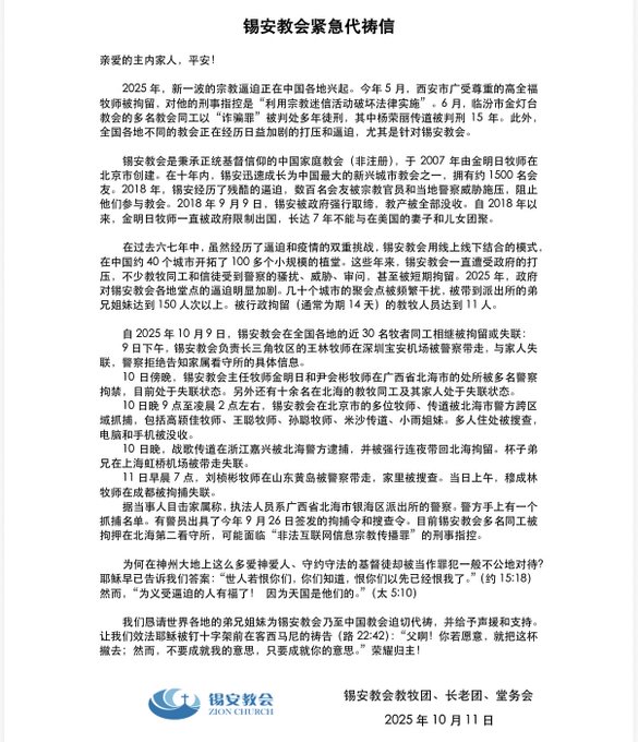 2018年以来最大規模の取り締まり 北京シオン教会が緊急祈祷を要請 2025年10月13日