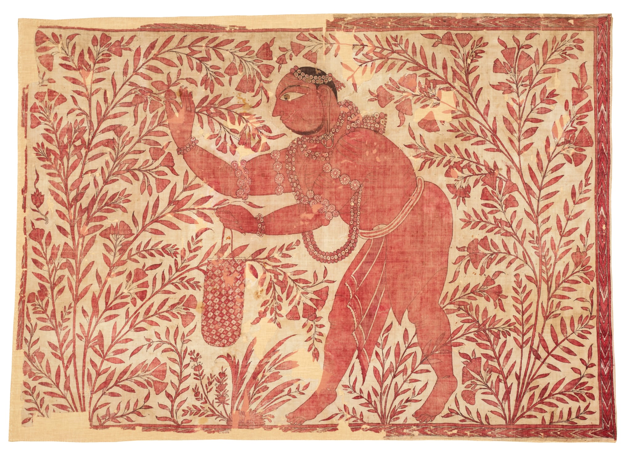 展示品のなかでとりわけ目を引いたのは、17~18世紀南東インドの《白地人物草花文様更紗儀礼用布》=冒頭図=で、花飾りを幾重にもまとう半裸の男が花の蕾を摘む姿がインド茜のみで染められる。神話や説話によらず強いシンボル性もなくただ日常の端景を赤単色で描く素朴な構成が、微細な描写や派手な色遣いも目立つ会場内にあってふしぎと際立つ。