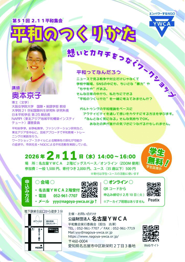 ■第51回2・11平和集会「平和のつくりかた――想いとカタチをつなぐワークショップ」(名古屋YWCA2・11平和集会実行委員会)2月11日(水)後2時~4時、名古屋YWCA2階(名古屋市中区)およびオンライン(Zoom)。講師=奥本京子(大阪女学院大学国際・英語学部教授)。一般1500円、寄付つき2千円、ユース(35歳以下)500円、学生無料。*寄付は学生・ユースのために。オンライン参加申込締切2月10日(火)後5時。Peatix (https://is.gd/KxO7i3)より申し込み。☎052-961-7707(同主催・吉澤)。