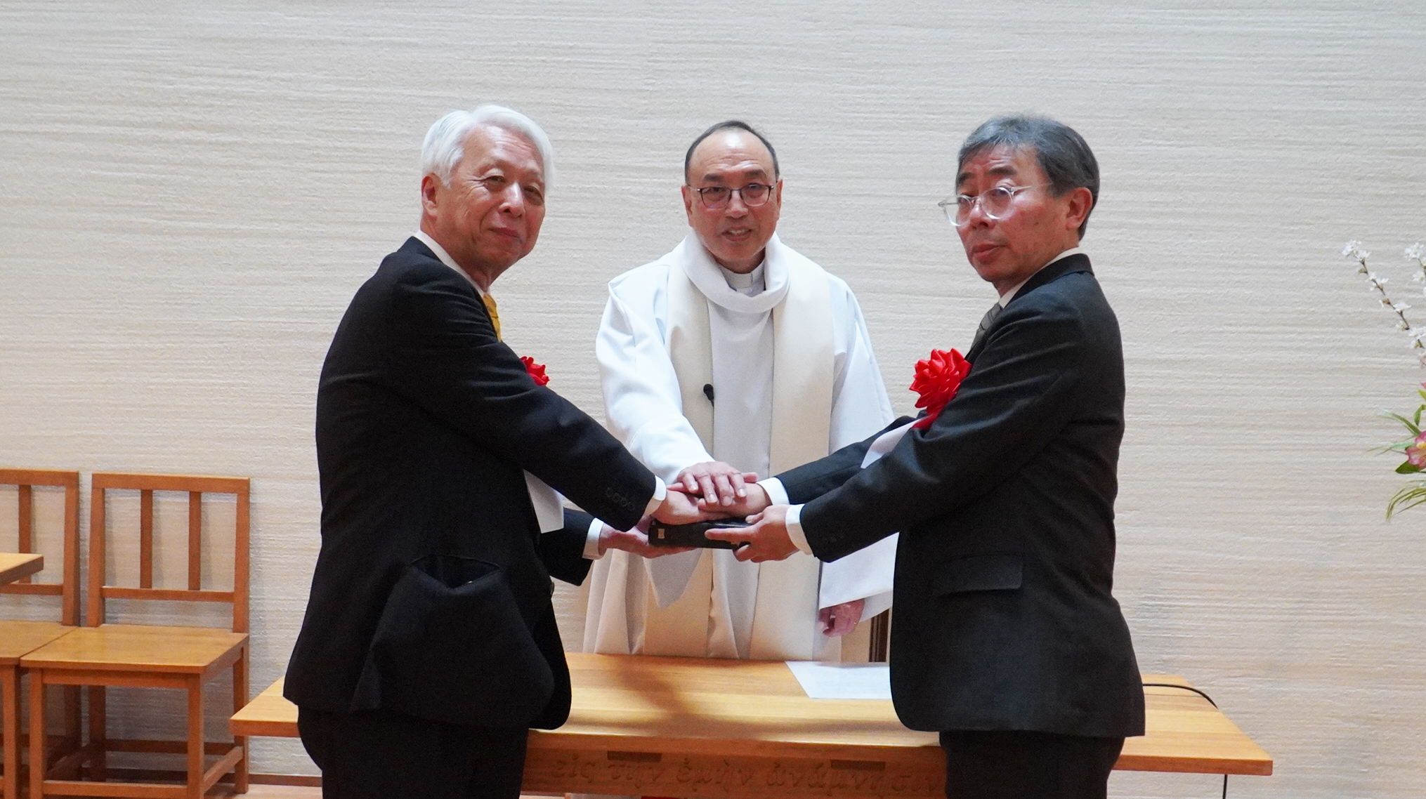 日本YMCA同盟は3月20日、日本基督教団番町教会(東京都新宿区)で国内外から関係者ら100人余りが見守る中、総主事就退任式を開催した。総主事および代表理事を務めてきた田口努氏が任期満了に伴い2026年3月31日で退任し、4月1日付で太田直宏氏=写真右=が新総主事に就任する。